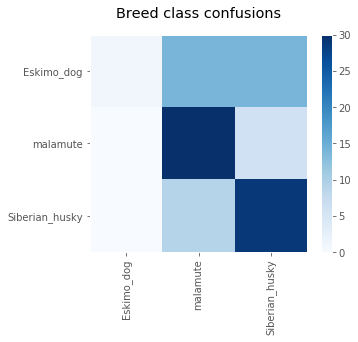The worst performing dog breed class was “Eskimo dog”, with a recall score of just 3%. So, which other classes are “Eskimo dog” images being confused with? If I look at a confusion matrix, it appears that only two other classes are accounting for most of the errors: “malamute” and “Siberian husky”.