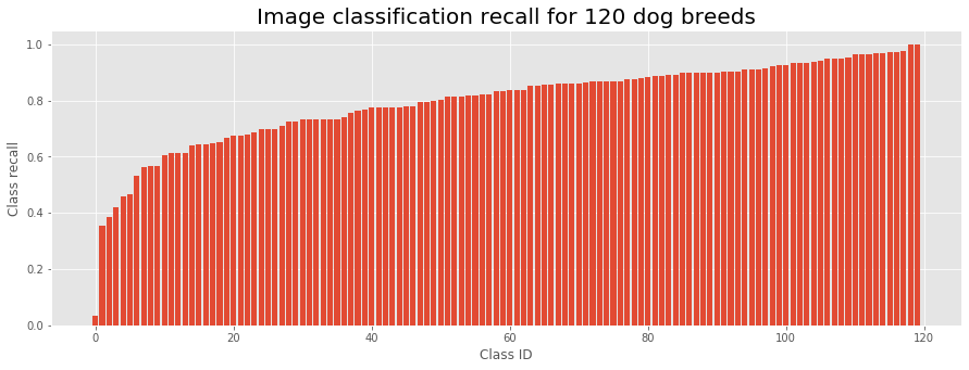 Training the model was a fairly simple procedure, though sometimes it was a bit fussy to get everything configured just right. The classifier performed very well overall, with most classes at > 80% recall. Hyperparameter tuning was more complicated, and was expensive, since every training run cost money to complete. I would not recommend hyperparameter tuning except as an exercise, your model is performing badly or you’re planning to deploy the model in production. For manual tuning, it helped to tune with a simpler task (in this case, classify only 10 breeds rather than the full 120), which greatly reduced training time.